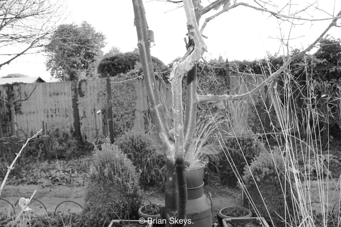 A winter tour, with the camera, around Our Garden@19 to capture some of the season’s shapes and silhouettes. This is an evergreen and topiary time of year, black and white pictures add to the wintery appearance.