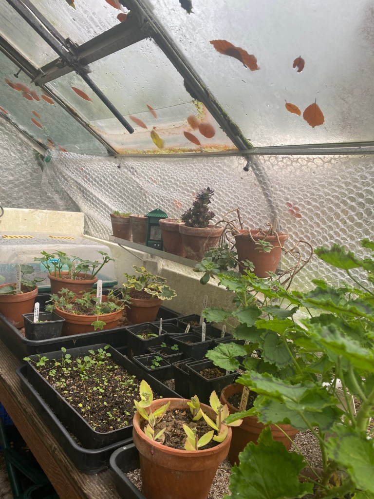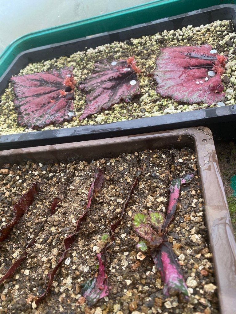 The one with the cuttings also contain two heated propagators. One has a vented lid on it with cuttings of Bergonia ‘Star Bright’.
